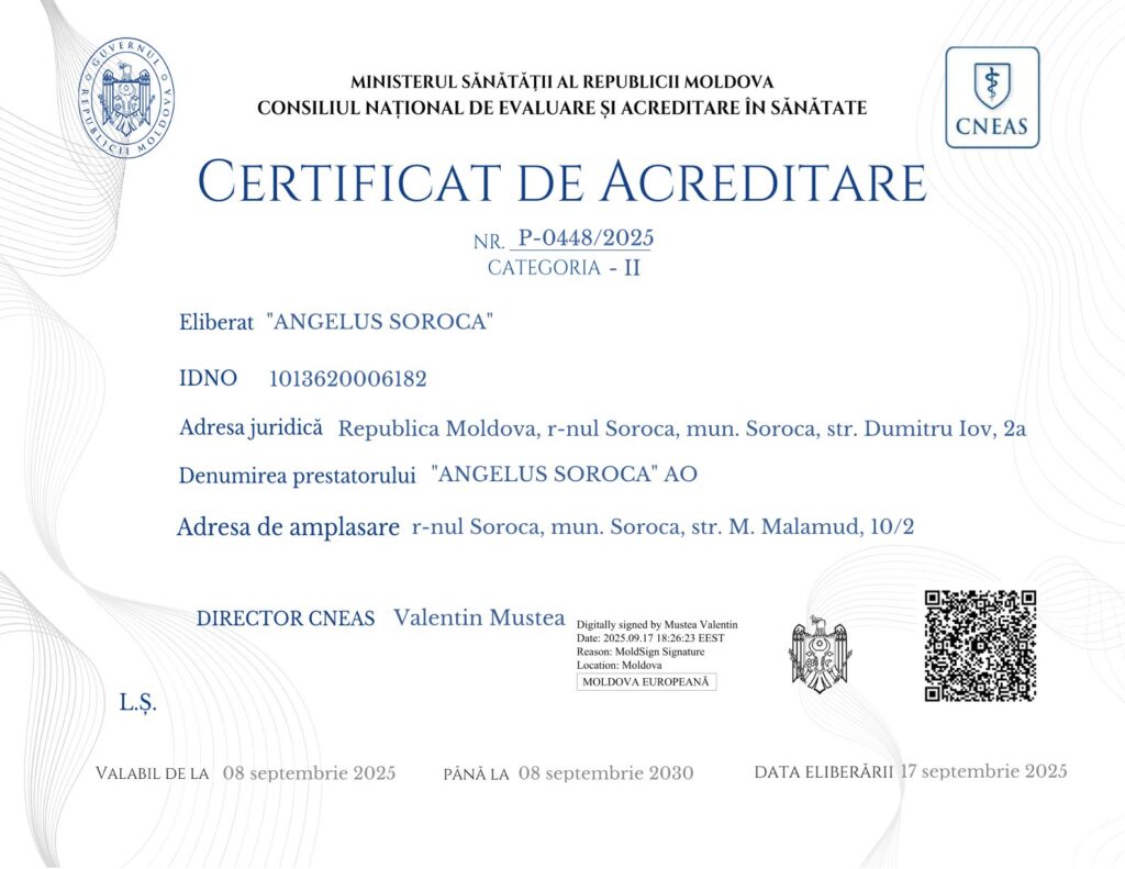 Asociația Obștească „Angelus Soroca” este acreditată conform legislației Republicii Moldova pentru prestarea serviciilor de îngrijire paliativă și asistență socială și suport comunitar.
